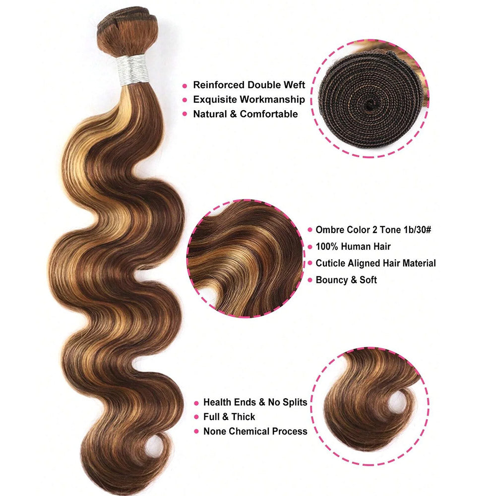 Brown With Honey Blonde Highlights 3 Bundles Brazilian Straight & Body Wave Human Hair Extensions