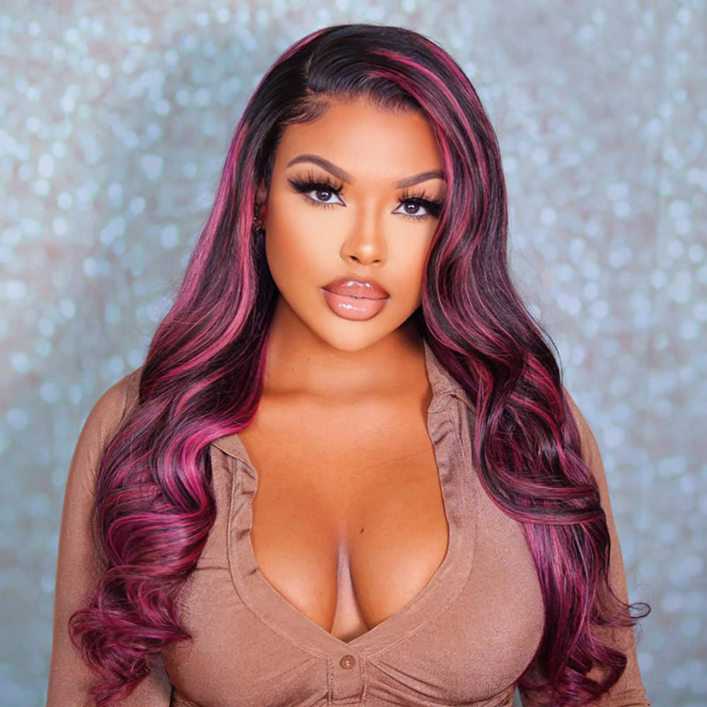 Megalook Bogo Free Transparent 13x4 Lace Front Wig Black Hair With Purple Highlights Straight Human Hair Wigs