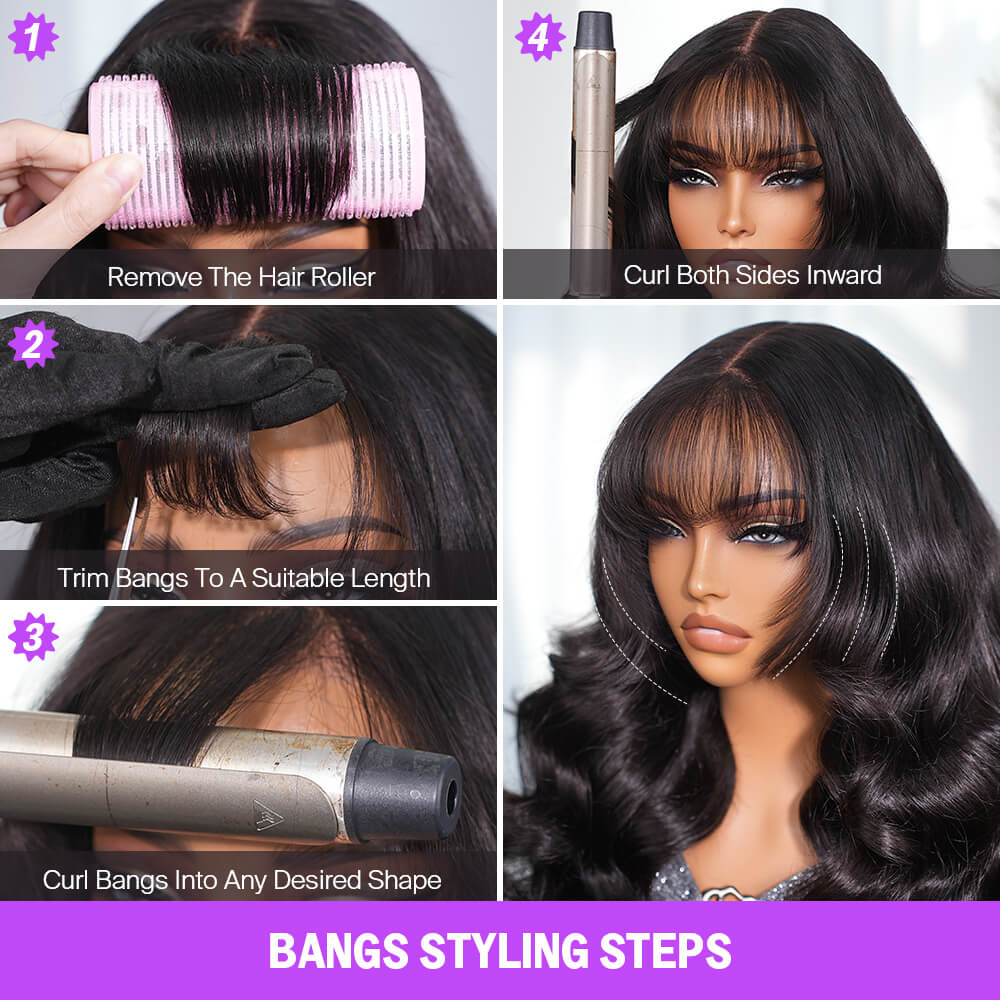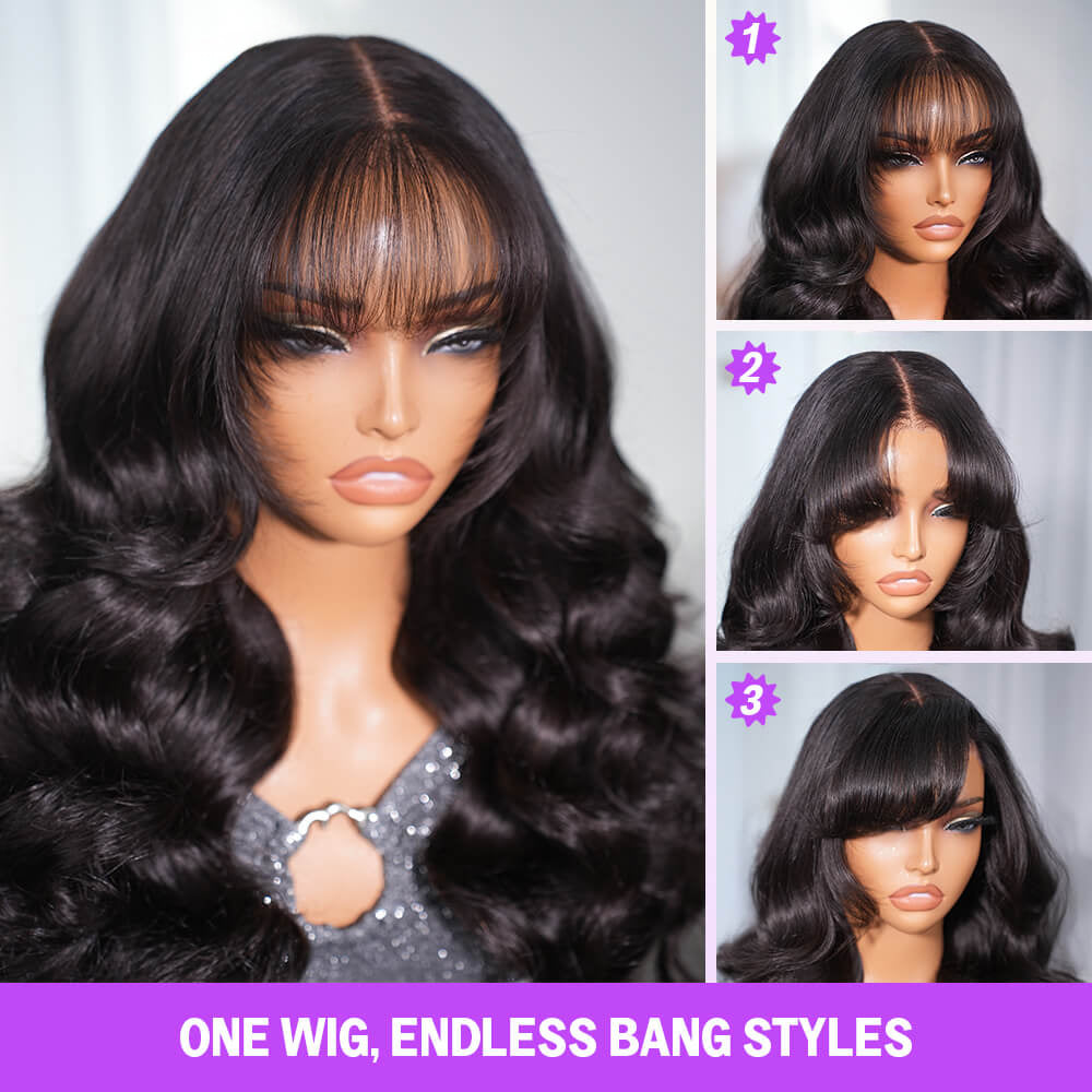 Megalook 13x6 Three-Go™ Glueless Body Wave Wig With Bangs With Drawstring Natural Black 100% Human Hair Wig
