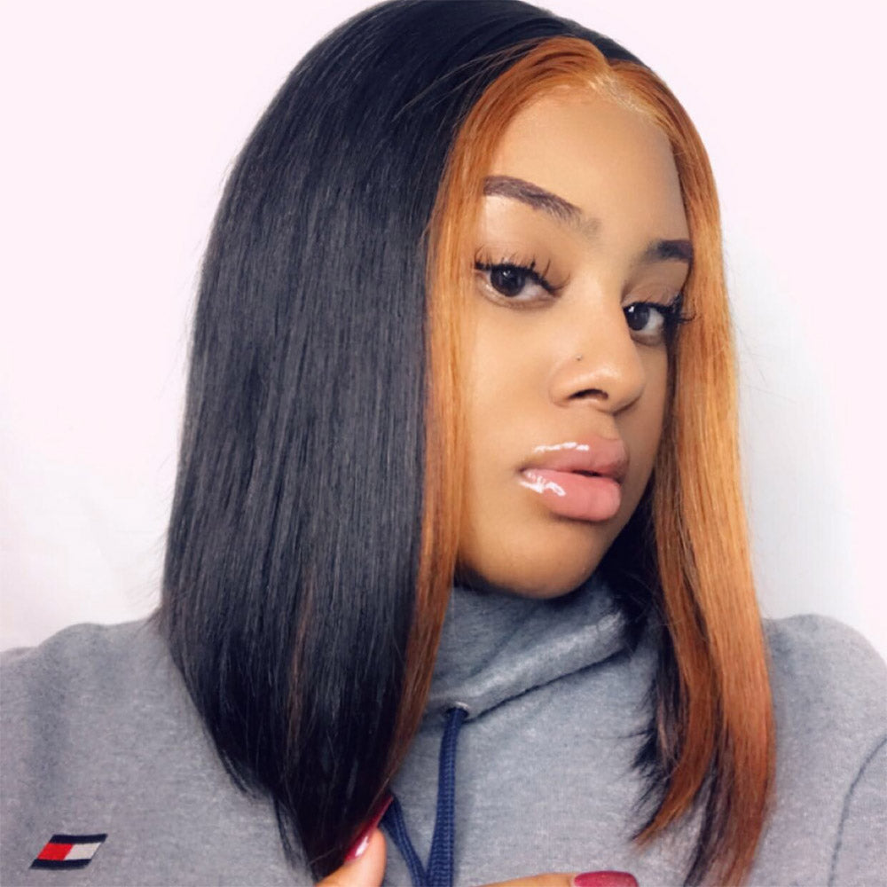 Megalook Bogo Free Black 13*4*1.5 T Part Bob Wig With Ginger Highlights In Front 12 14 Inch Human Hair