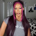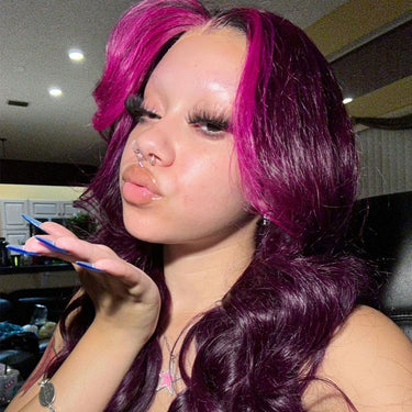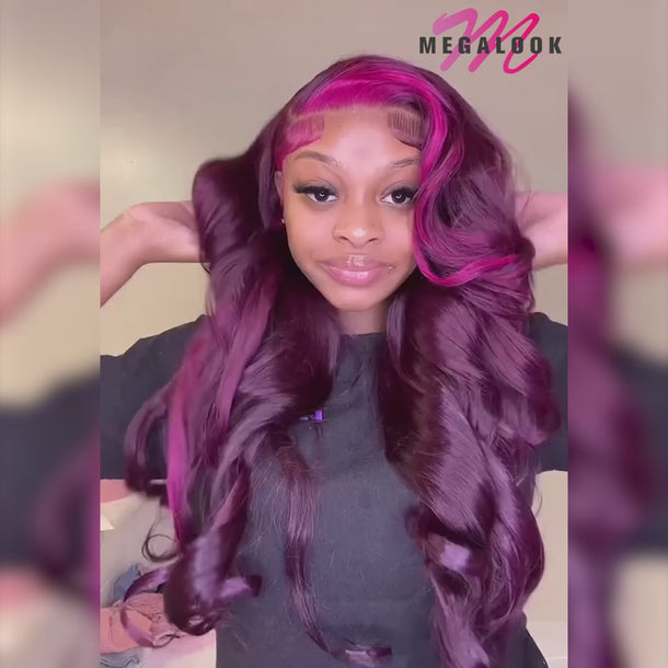 Megalook 13x4 Lace Frontal Glueless Dark Plum Skunk Stripe Straight Wigs Invisible Knots Natural Edges