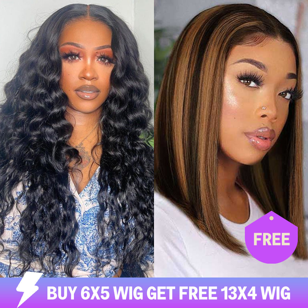 Limited-Time Offer-Pre-Cut Glueless 6x5 Lace Closure Loose Curly+13x4 Lace 1BP30 Bob Straight Wig
