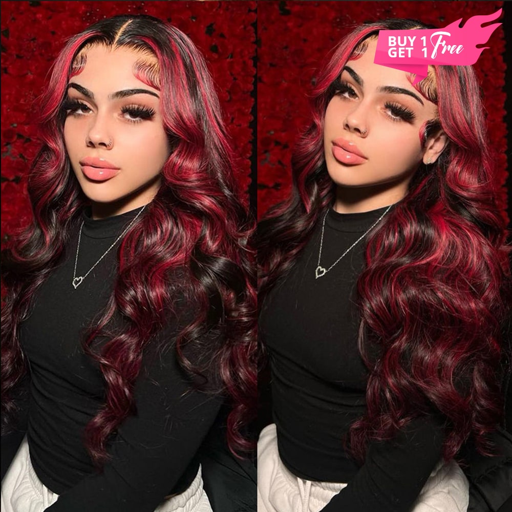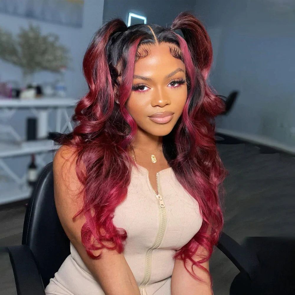 Special offer | 18inch = $94.96 New Dark Burgundy With Rose Red Highlights Body Wave 13x4 Lace Front Hand Curls Wig